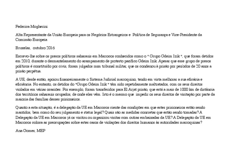 Escrevo-lhe sobre os presos polticos saharauis em Marrocos conhecidos como o " Grupo Gdeim Izik ", que foram detidos