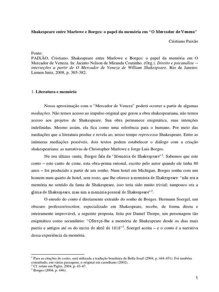 Shakespeare entre Marlowe e Borges: o papel da memria em O Mercador de Veneza