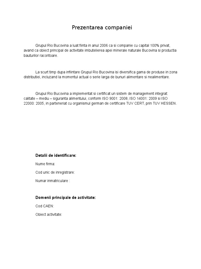 Compania Rio Bucovina are ca obiect principal de activitate imbutelierea apei