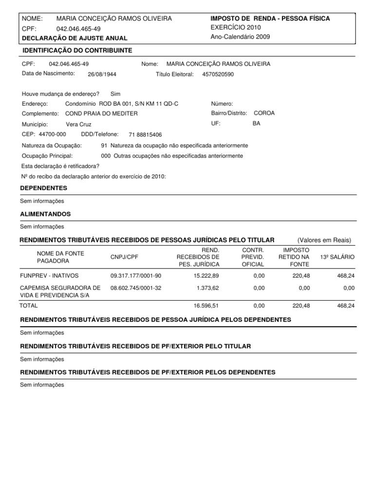 NOME: MARIA CONCEIO RAMOS OLIVEIRA IMPOSTO DE RENDA - PESSOA FSICA