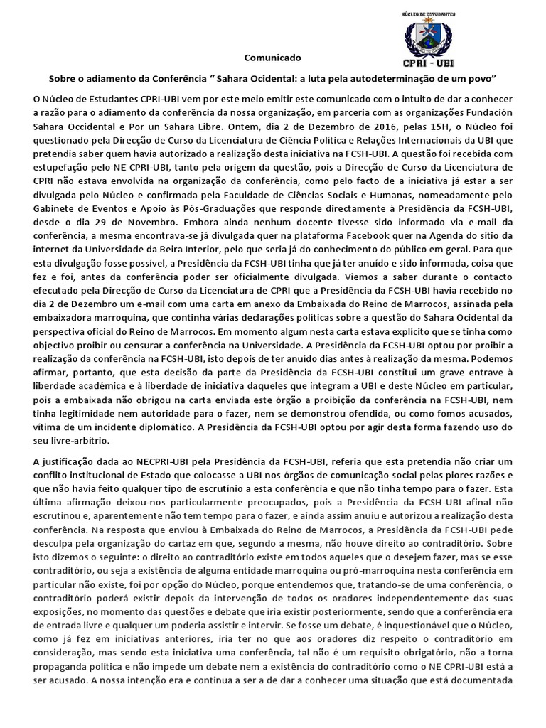 O Ncleo de Estudantes CPRI-UBI vem por este meio emitir este comunicado com o intuito de dar a conhecer