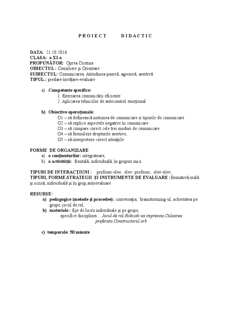 i altor trei colegi s-i nsoeasc. Pe rnd, elevii trebuie s simuleze comportamentul pasiv,
