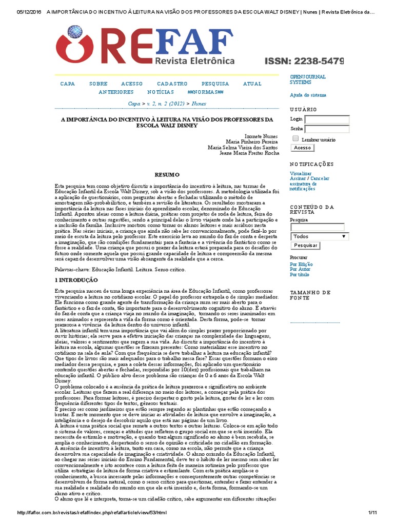 AIMPORTNCIADOINCENTIVOLEITURANAVISODOSPROFESSORESDAESCOLAWALTDISNEY|Nunes|RevistaEletrnicada