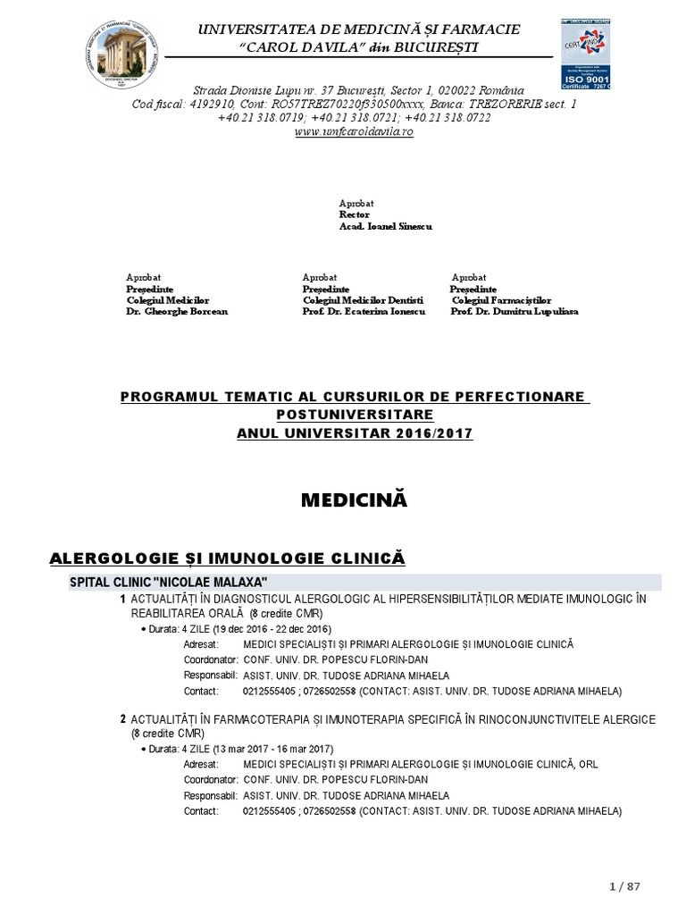 desfasurare a cursului. Inscrierile se fac la Rectoratul Universitatii de Medicina si Farmacie CAROL