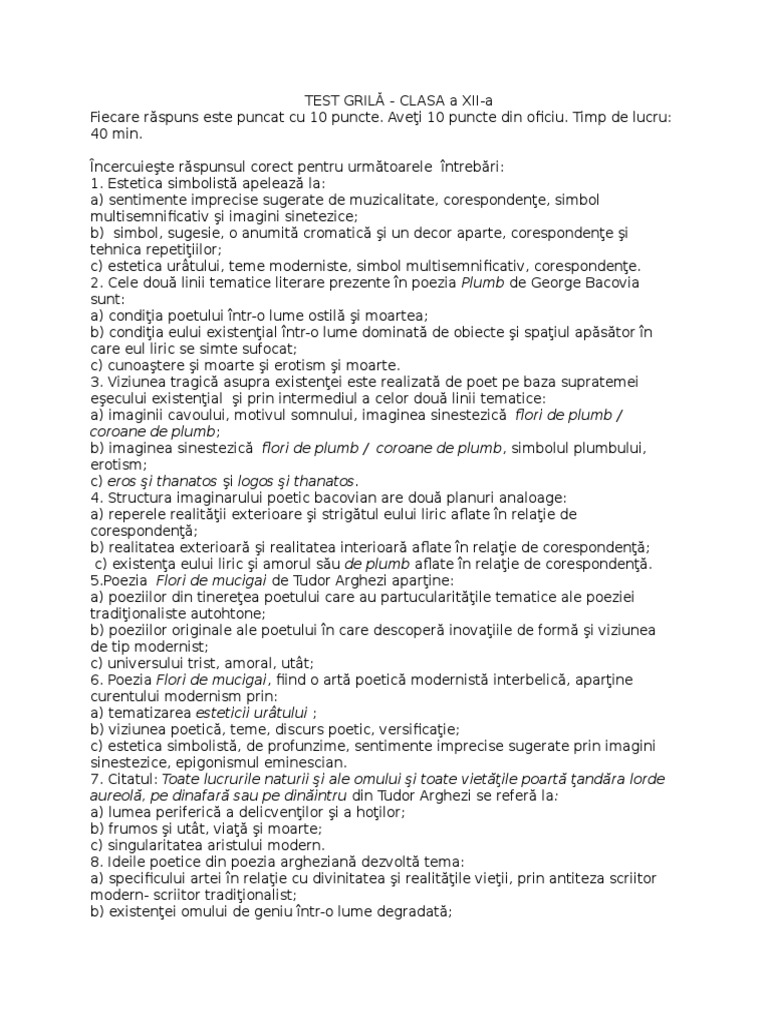 Fiecare rspuns este puncat cu 10 puncte. Avei 10 puncte din oficiu. Timp de lucru: