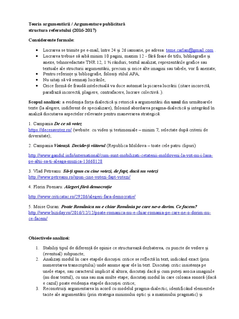 Scopul analizei: a evidenia fora dialectic i retoric a argumentrii din unul din urmtoarele