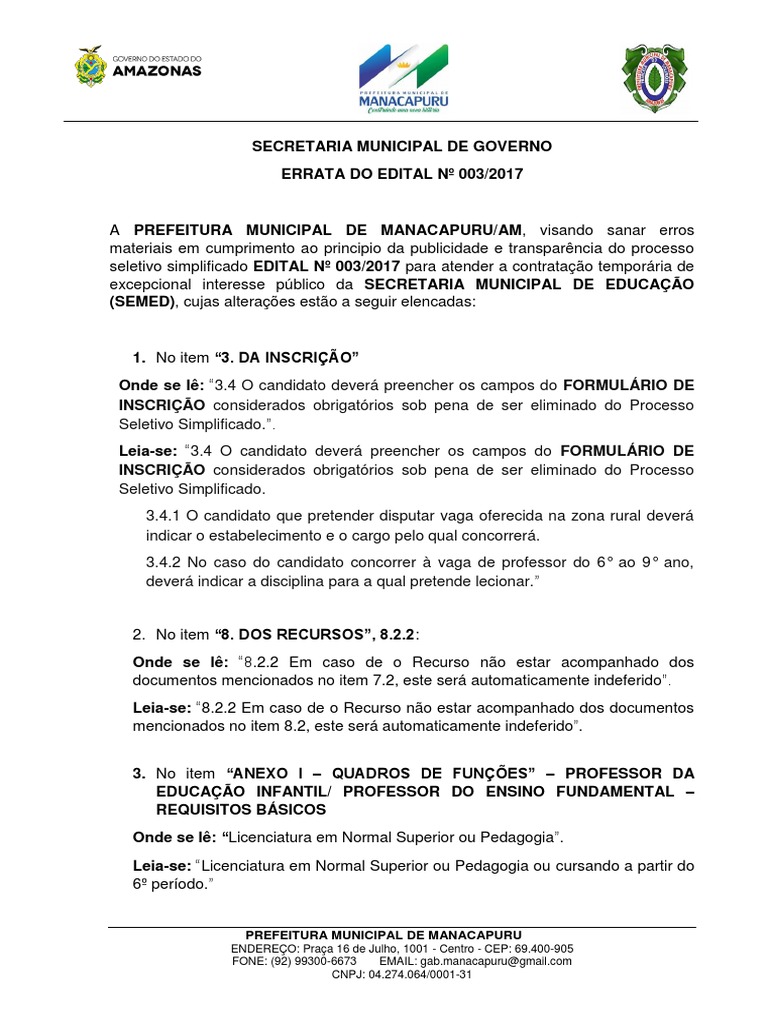 A PREFEITURA MUNICIPAL DE MANACAPURU/AM, visando sanar erros