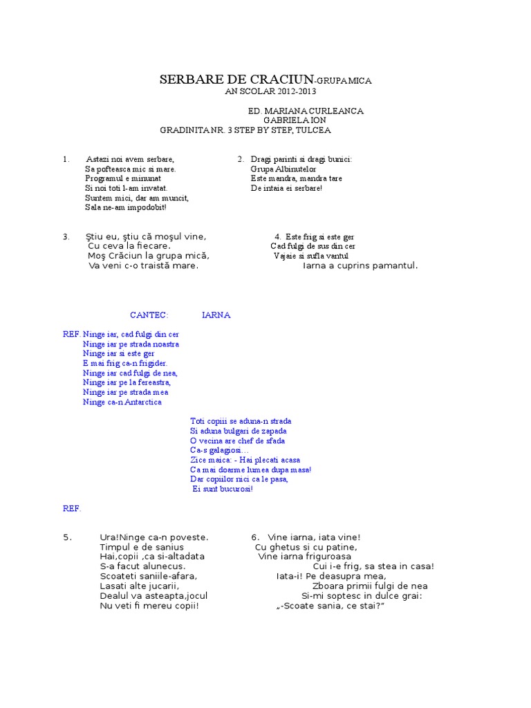 1. Astazi noi avem serbare, 2. Dragi parinti si dragi bunici: