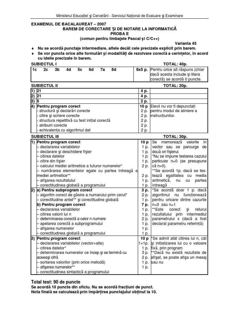 Nu se acord punctaje intermediare, altele dect cele precizate explicit prin barem.