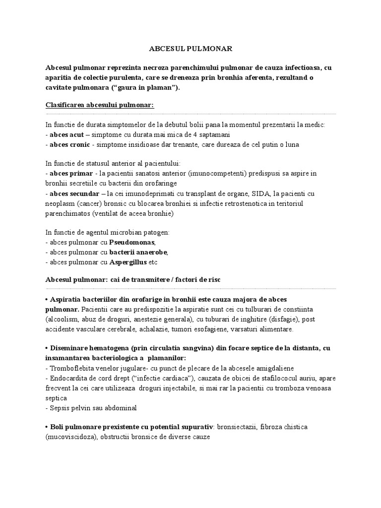 Abcesul pulmonar reprezinta necroza parenchimului pulmonar de cauza infectioasa, cu