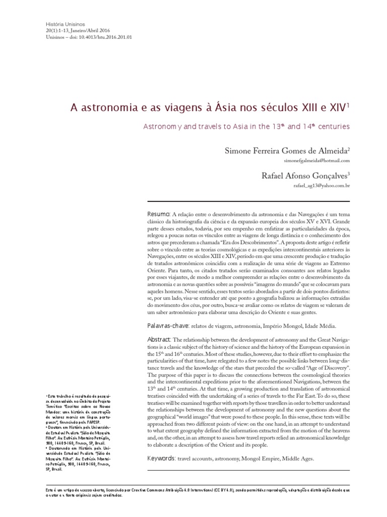 Palavras-chave: relatos de viagem, astronomia, Império Mongol, Idade Média.