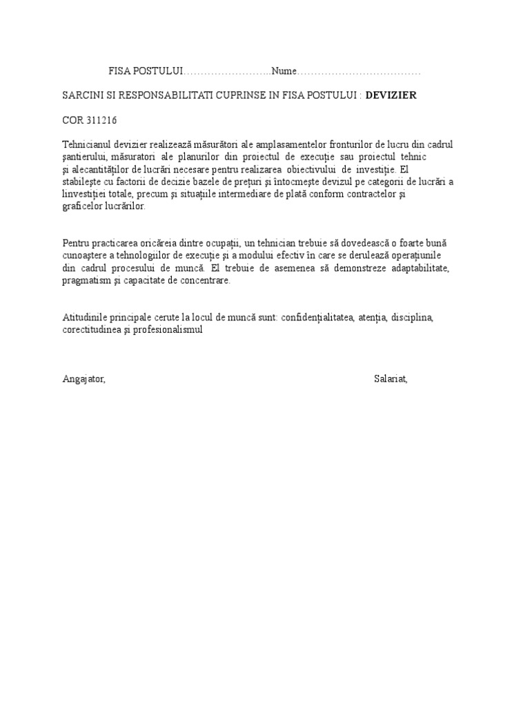 SARCINI SI RESPONSABILITATI CUPRINSE IN FISA POSTULUI : DEVIZIER