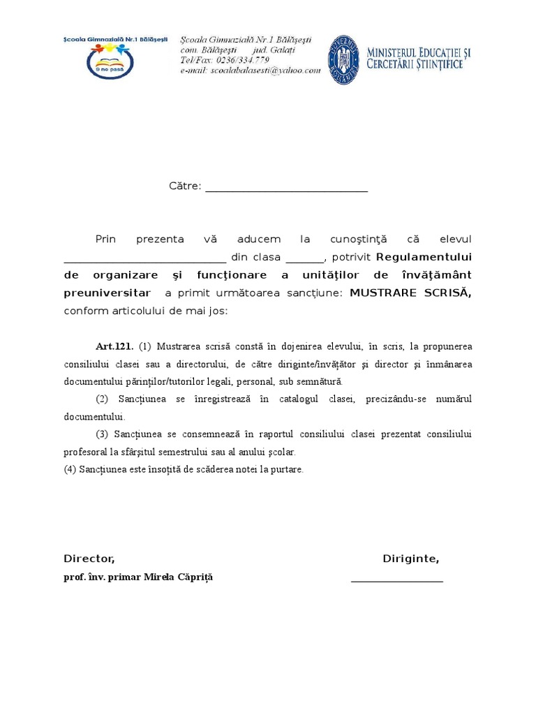 preuniversitar a primit urmtoarea sanciune: MUSTRARE SCRIS,