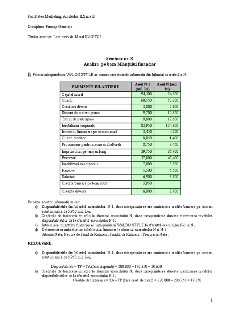 1. Pentru intreprinderea WALDO STYLE se cunosc urmatoarele informatii din bilantul exercitiului N: