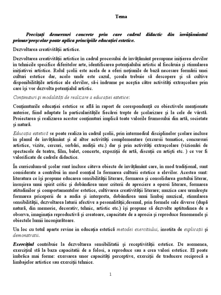 Educaia estetic se poate realiza n cadrul colii, prin intermediul disciplinelor colare incluse