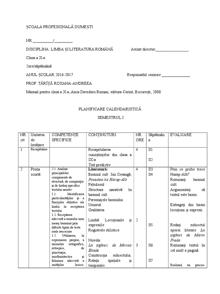 DISCIPLINA: LIMBA I LITERATURA ROMN Avizat director,________________
