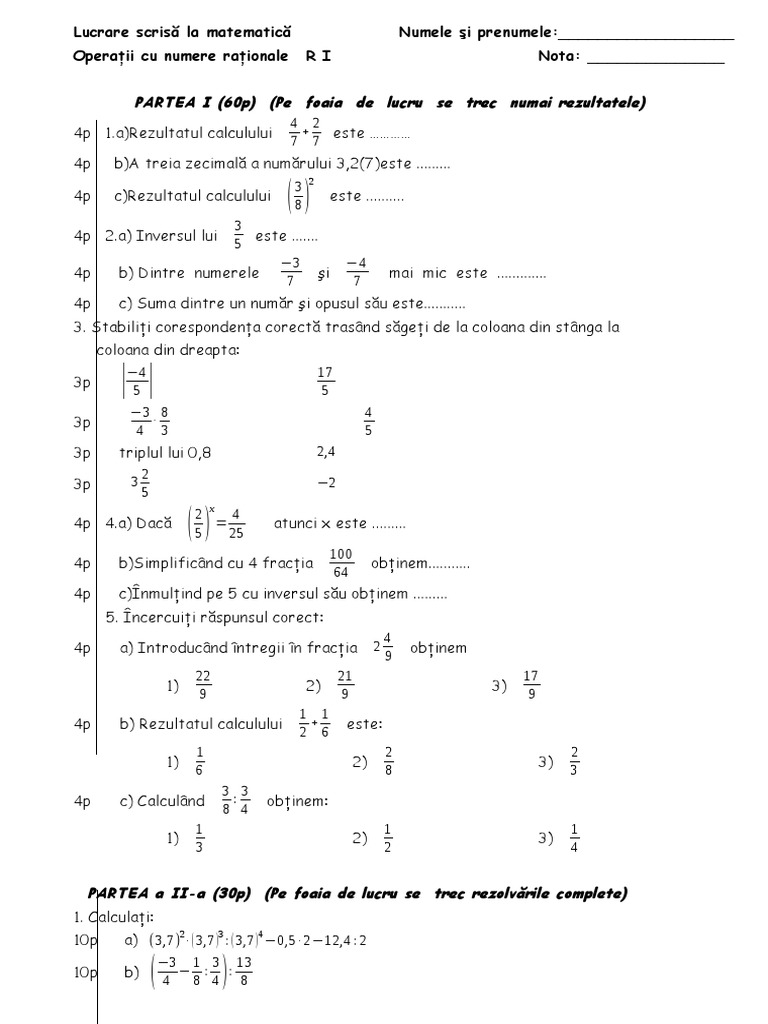 Operaii cu numere raionale R II Nota: ______________