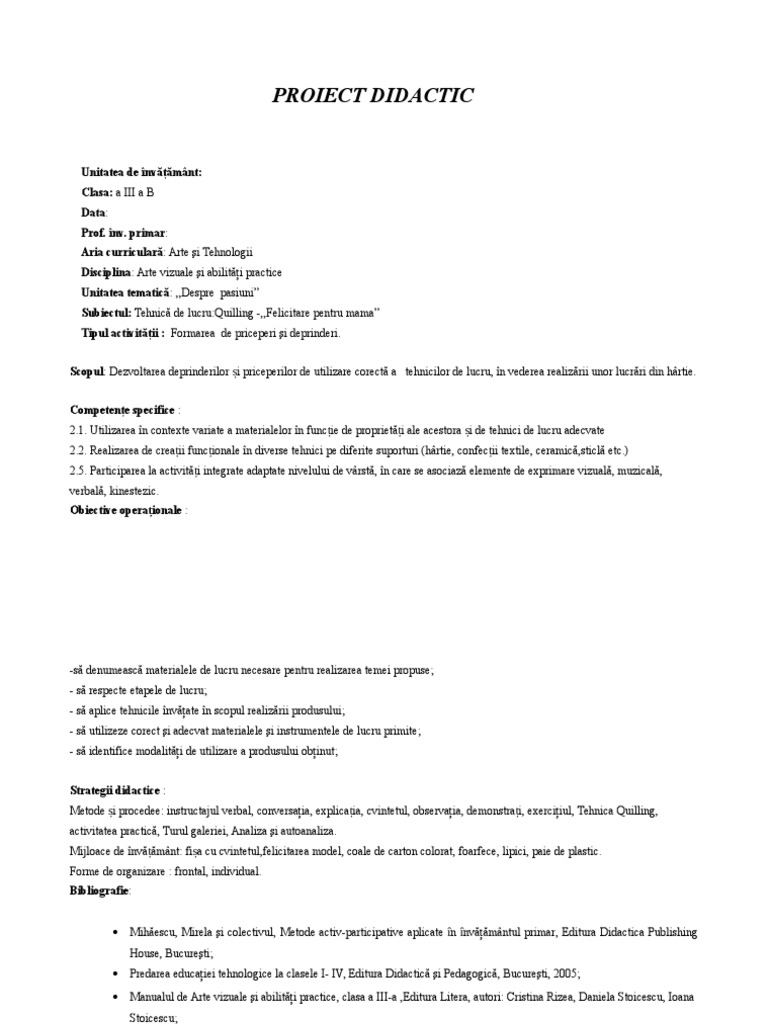 Metode i procedee: instructajul verbal, conversaia, explicaia, cvintetul, observaia, demonstrai, exerciiul, Tehnica Quilling,