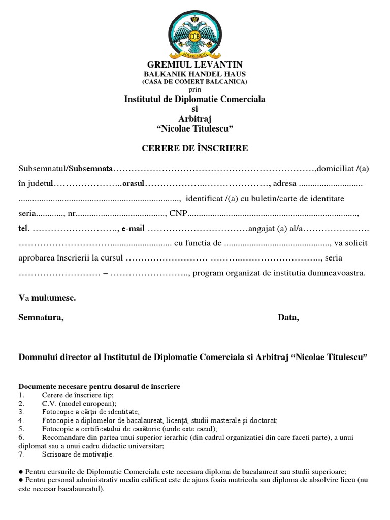 Pentru cursurile de Diplomatie Comerciala este necesara diploma de bacalaureat sau studii superioare;