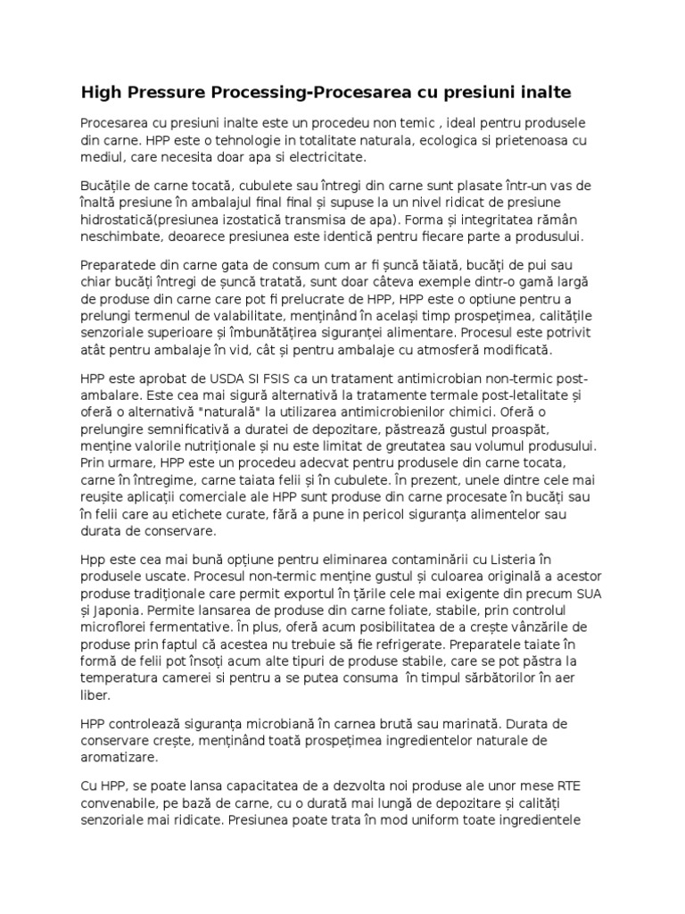 HPP controleaz sigurana microbian n carnea brut sau marinat. Durata de