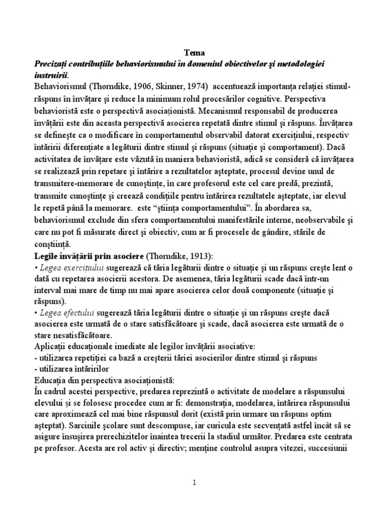 Precizai contribuiile behaviorismului n domeniul obiectivelor i metodologiei