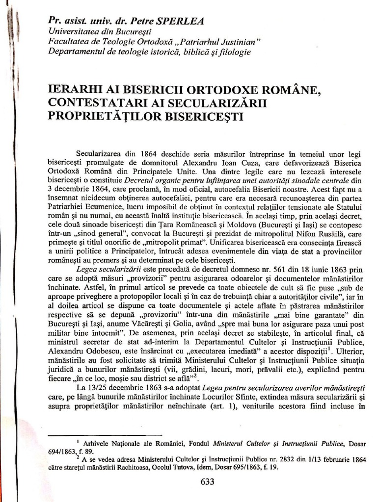 Scurta prezentare a secularizarii averilor manastirsti din timpul domnitorului Alexandru Ioan Cuza, in Anuarul Facultatii de Teologie Ortodoxa Justinian Patriarhul, 2013.