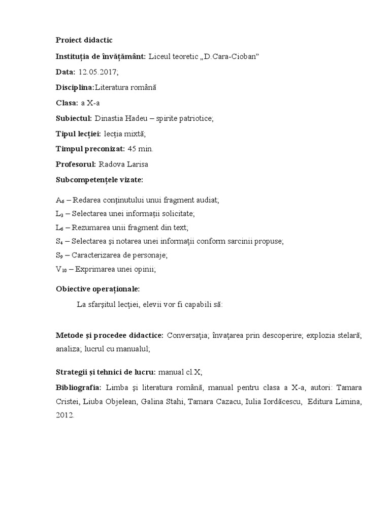 Subiectul: Dinastia Hadeu spirite patriotice;