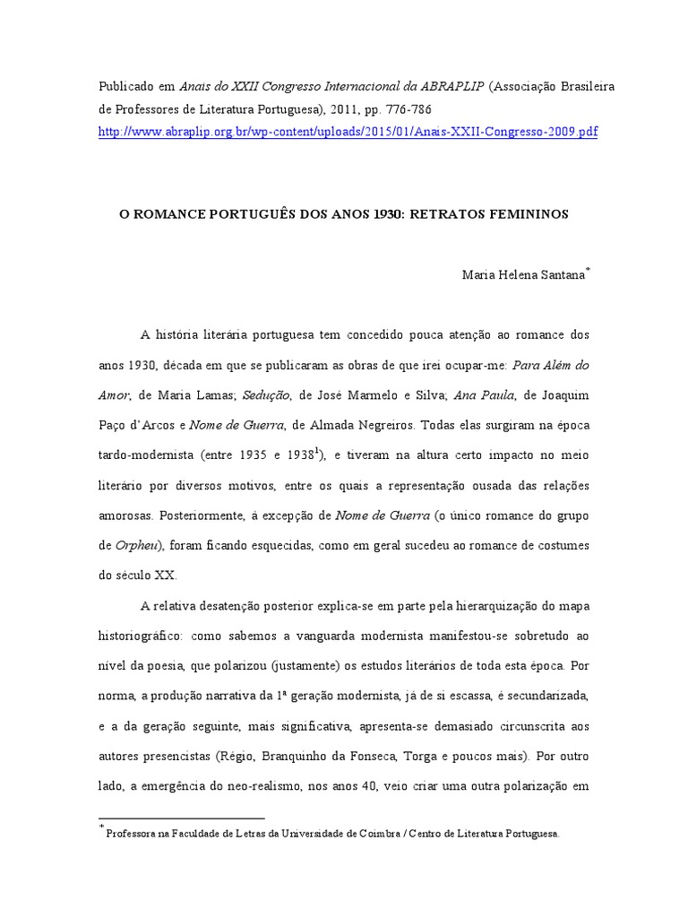 O ROMANCE PORTUGUS DOS ANOS 1930: RETRATOS FEMININOS