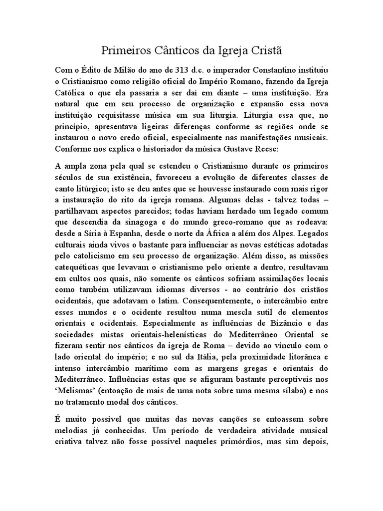 Ainda conforme Gustave Reese, a msica nos primrdios do cristianismo
