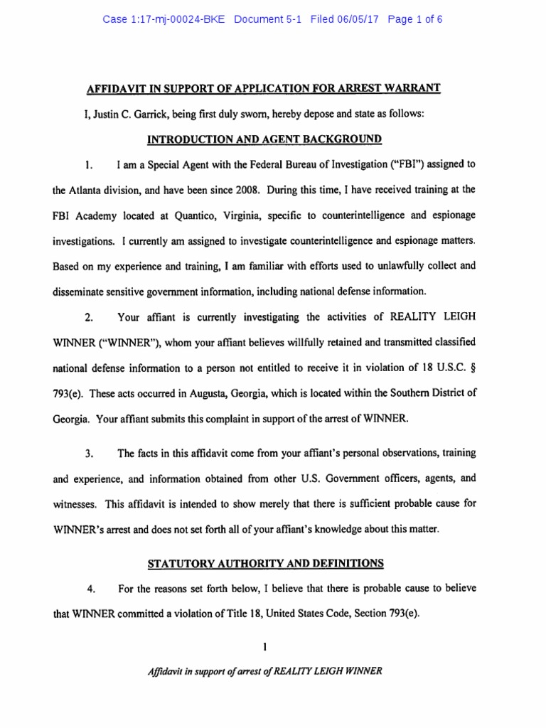 Affidavit in support ofarrest ofREALITY LEIGH WINNER