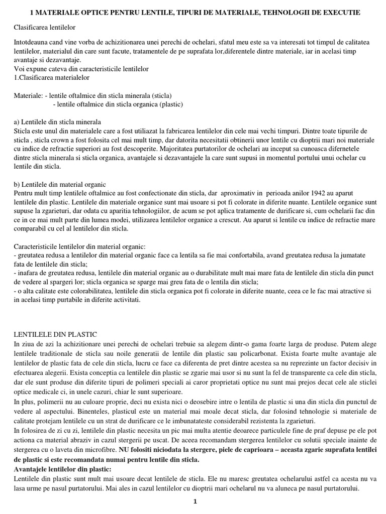 1 MATERIALE OPTICE PENTRU LENTILE, TIPURI DE MATERIALE, TEHNOLOGII DE EXECUTIE