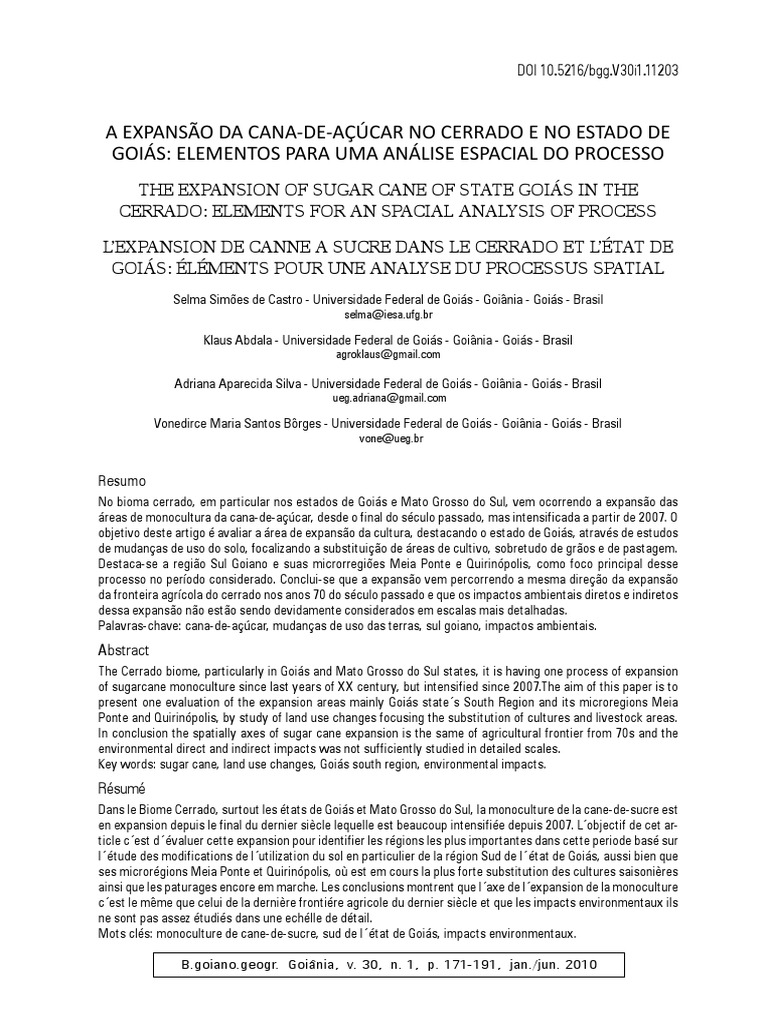 -açúcar nas áreas de cerrado no Centro-Sul do país, com ênfase especial à produção canavieira no estado de Goiás, mediante a realização de estudos multiescalares no tempo e no espaço, com o apoio de imagens de satélite, de sistemas de informação geográfica de monitoramento e de dados censi- tários e similares, com o objetivo de compreender o processo de conversão das áreas não produtoras em produtoras de cana, para discutir possíveis consequências em termos de impactos diretos e indiretos do processo.