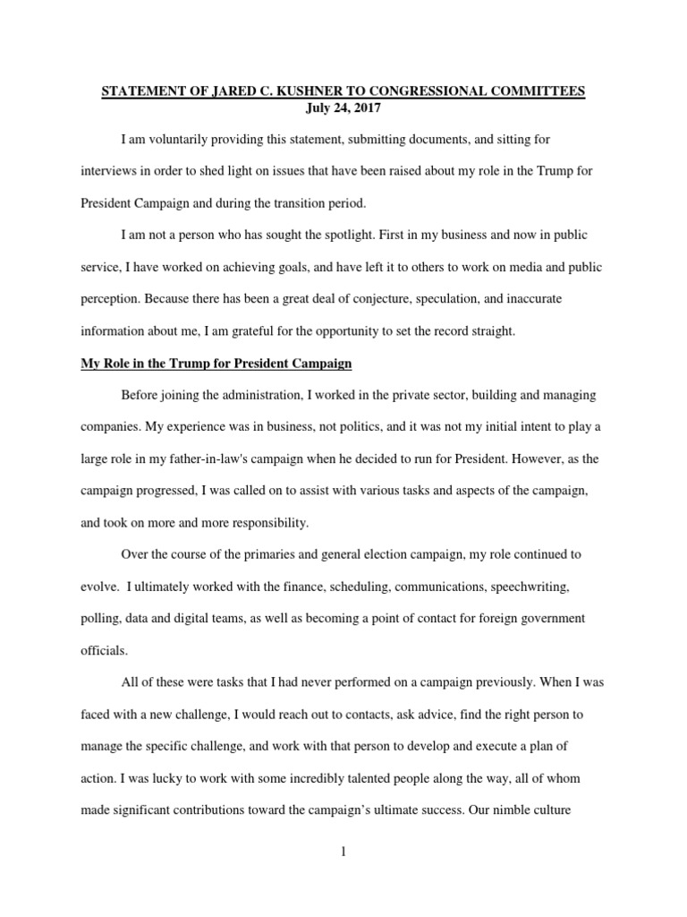 STATEMENT OF JARED C. KUSHNER TO CONGRESSIONAL COMMITTEES July 24, 2017