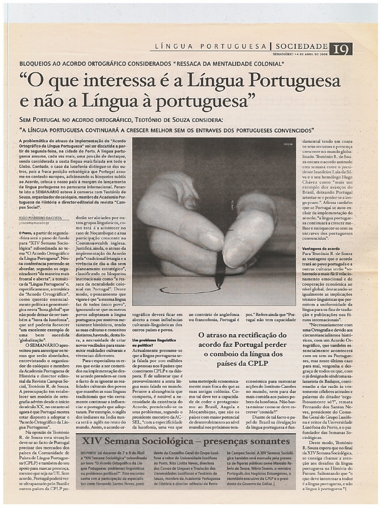 Realizou-se na Universidade Lusófona do Porto na segunda semana de Abril de 2008 a "XIV Semana Sociológica da ACSEL subordinada ao tema "O Acordo Ortográfico da Língua Portuguesa". O SEMANÁRIO aproveitou para antecipar os temas que serão abordados, entrevistando o organizador do colóquio e membro da Academia Portuguesa de História e diretor editorial da revista Campus Social, Teotónio R. de Souza. Frisou que no contexto e realidade das forças económicas e outras dentro da CPLP, "o que interessa é a Língua Portuguesa e não a Língua à portuguesa".