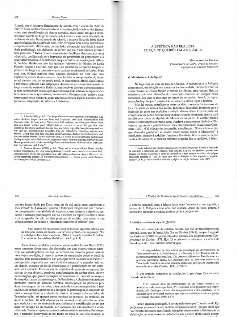 "Na trajectória da obra de Eça de Queirós, O Mandarim e A Relíquia representam, em relação aos romances da fase realista, como O Crime do Padre Amaro, O Primo Basílio e mesmo Os Maias uma ruptura. Esta se evidencia por uma alteração de concepção estética: ao compor esses romances, Eça não se restringe ao limite do verosímil, isto é, da representação daquilo que é possível acontecer, e deixa lugar à fantasia. "[...]