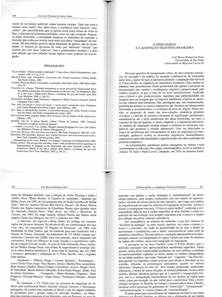 O estudioso avalia a relação intersemiótica bem como a especificidade de dois códigos na adaptação televisiva da obra O Primo Basílio de Eça de Queirós.