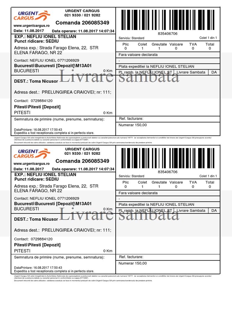 Documentul descrie transportul unui colet de la NEFLIU IONEL STELIAN din București la Toma Nicusor din Pitești prin compania Urgent Cargus.