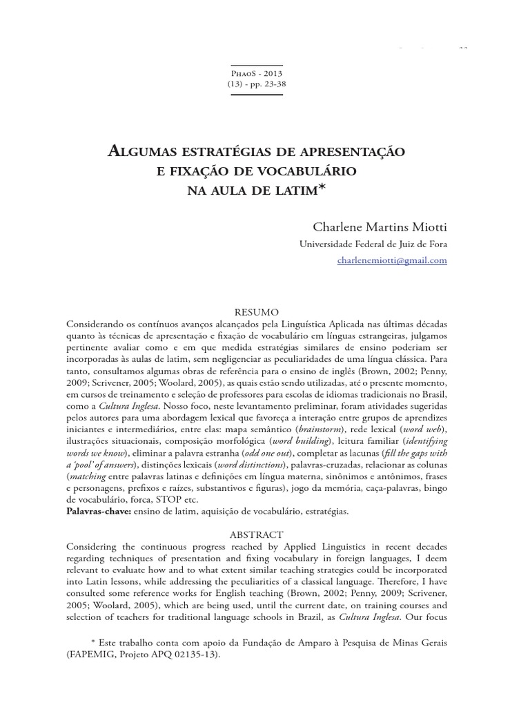 aBSTRaCT Considering the continuous progress reached by applied Linguistics in recent decades regarding techniques of presentation and fixing vocabulary in foreign languages, I deem relevant to evaluate how and to what extent similar teaching strategies could be incorporated into Latin lessons, while addressing the peculiarities of a classical language. Therefore, I have consulted some reference works for english teaching (Brown, 2002; Penny, 2009; Scrivener, 2005; Woolard, 2005), which are being used, until the current date, on training courses and selection of teachers for traditional language schools in Brazil, as Cultura Inglesa. our focus