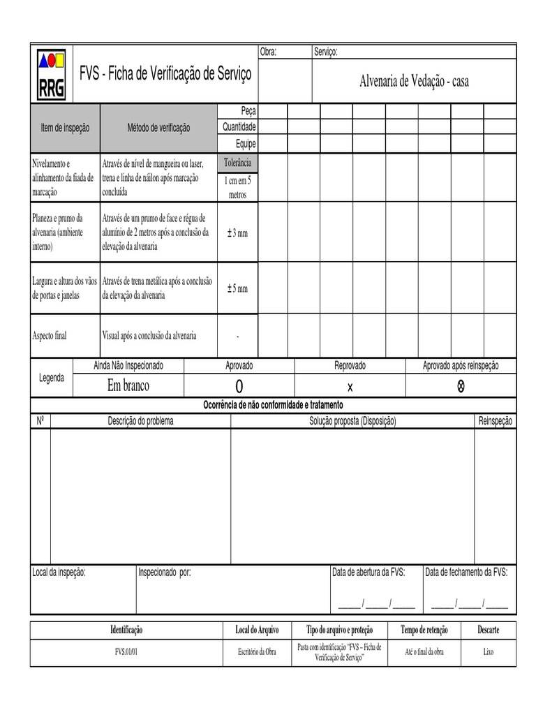 FVS - Ficha de Verificao de Servio Alvenaria de Vedao - casa