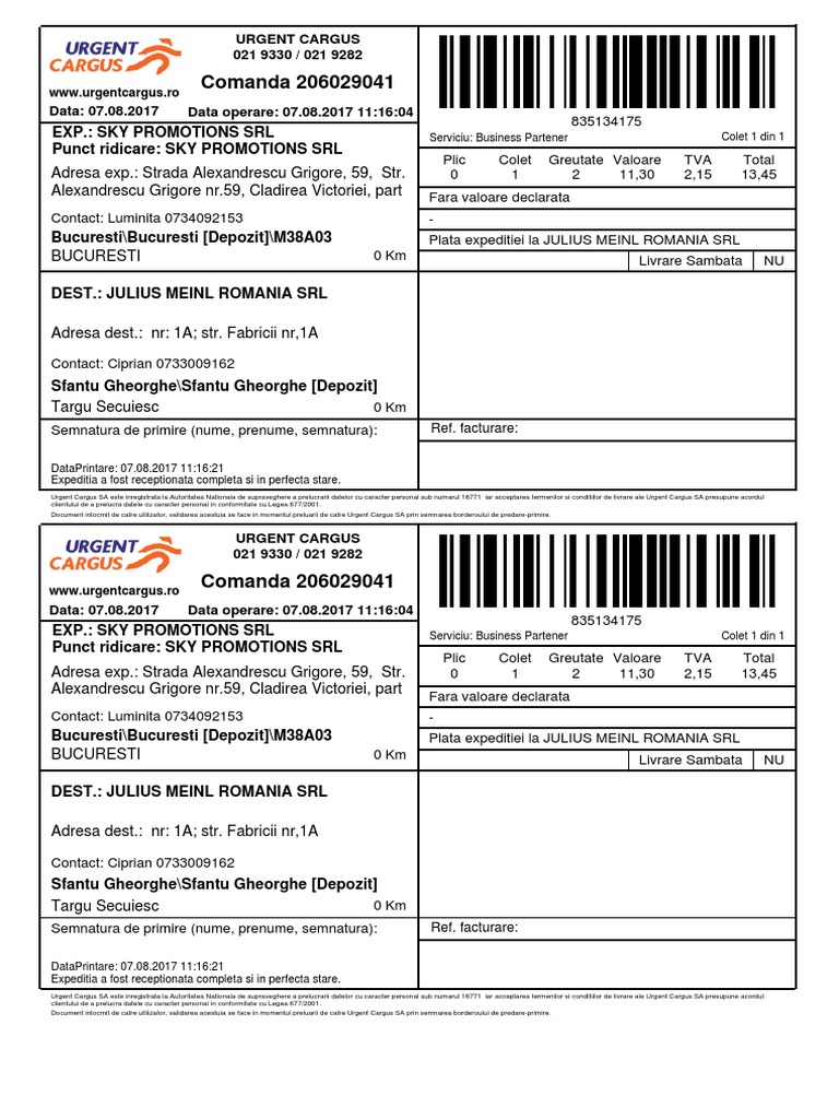 Document intocmit de catre utilizator, validarea acestuia se face in momentul preluarii de catre Urgent Cargus SA prin semnarea borderoului de predare-primire.