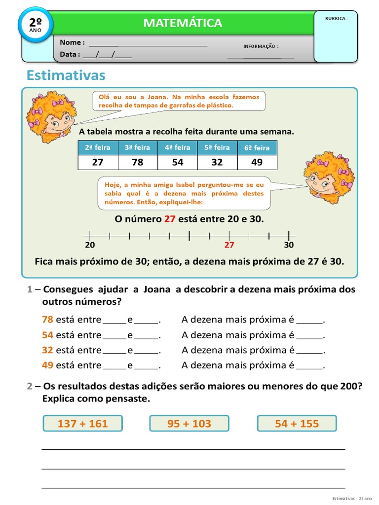 1 – Sem calculares os valores exatos, assinala com X as etiquetas que têm os números que mais se aproximam dos resultados das adições.