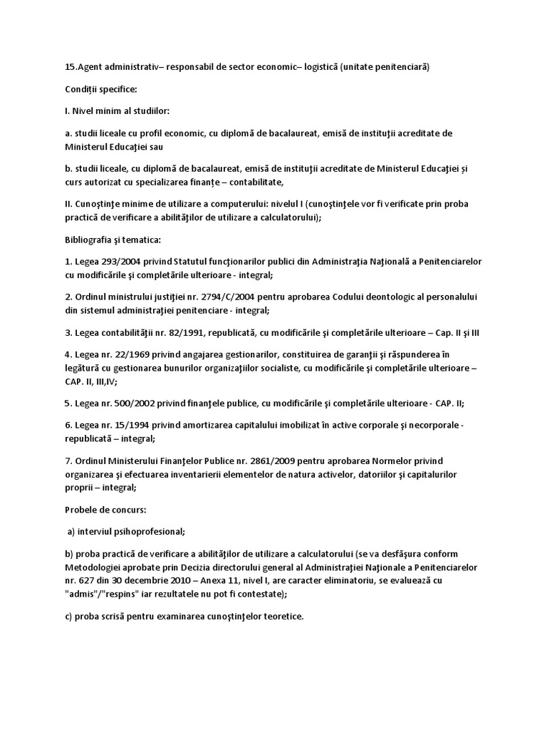 Agent administrativ responsabil de sector economic logistic (unitate penitenciar)