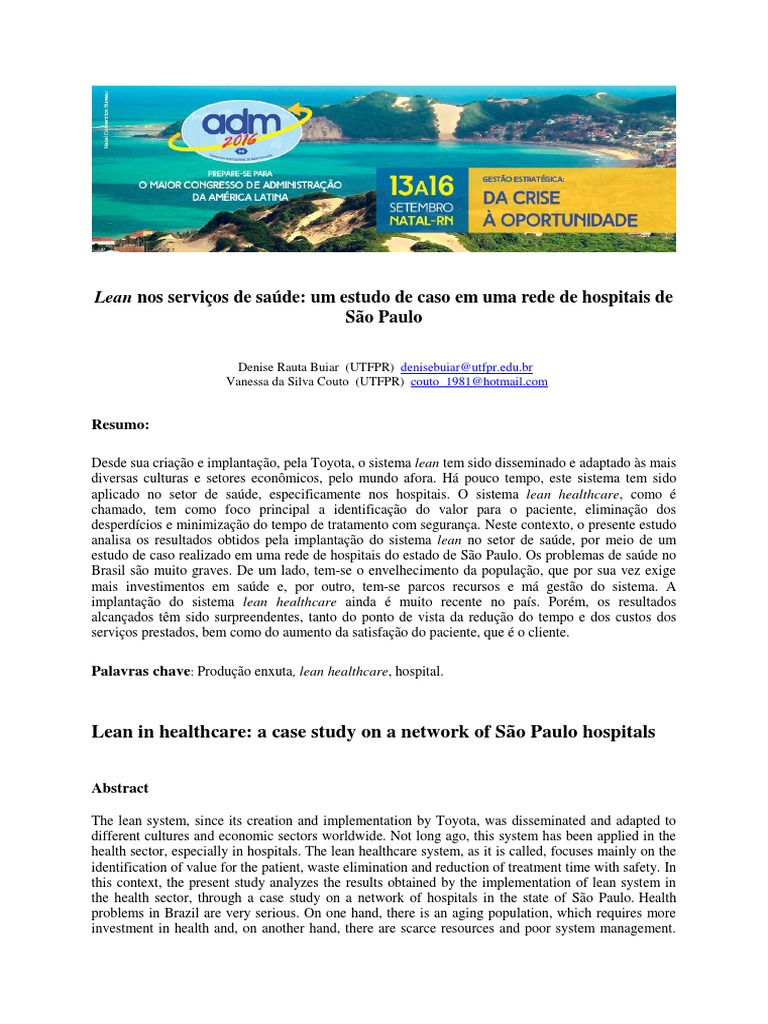 Palavras chave: Produção enxuta, lean healthcare, hospital.