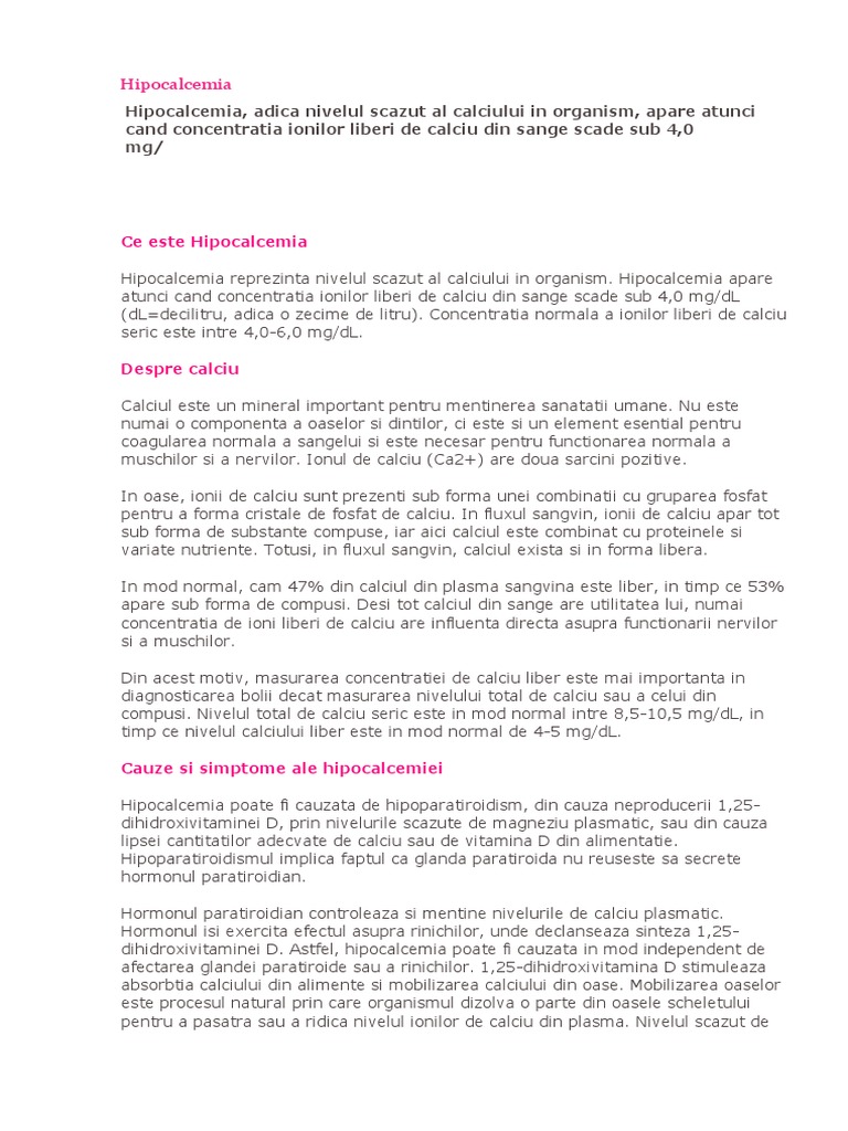 Hipocalcemia reprezinta nivelul scazut al calciului in organism. Hipocalcemia apare