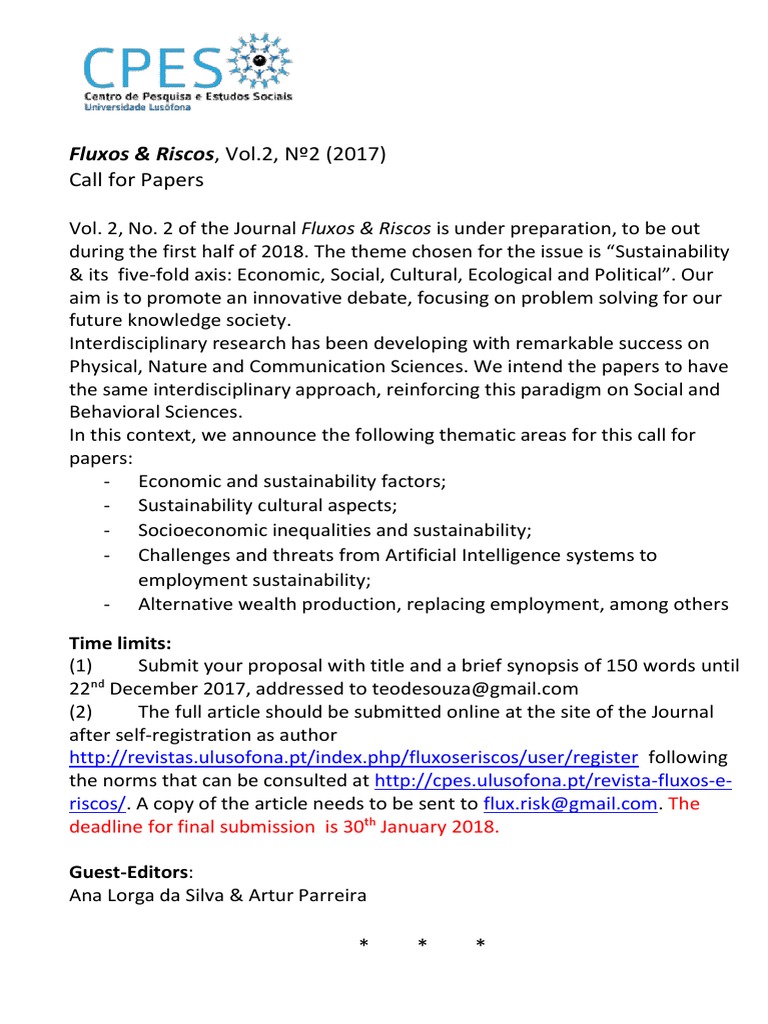 Vol. 2, No. 2 of the Journal Fluxos & Riscos is under preparation, to be out