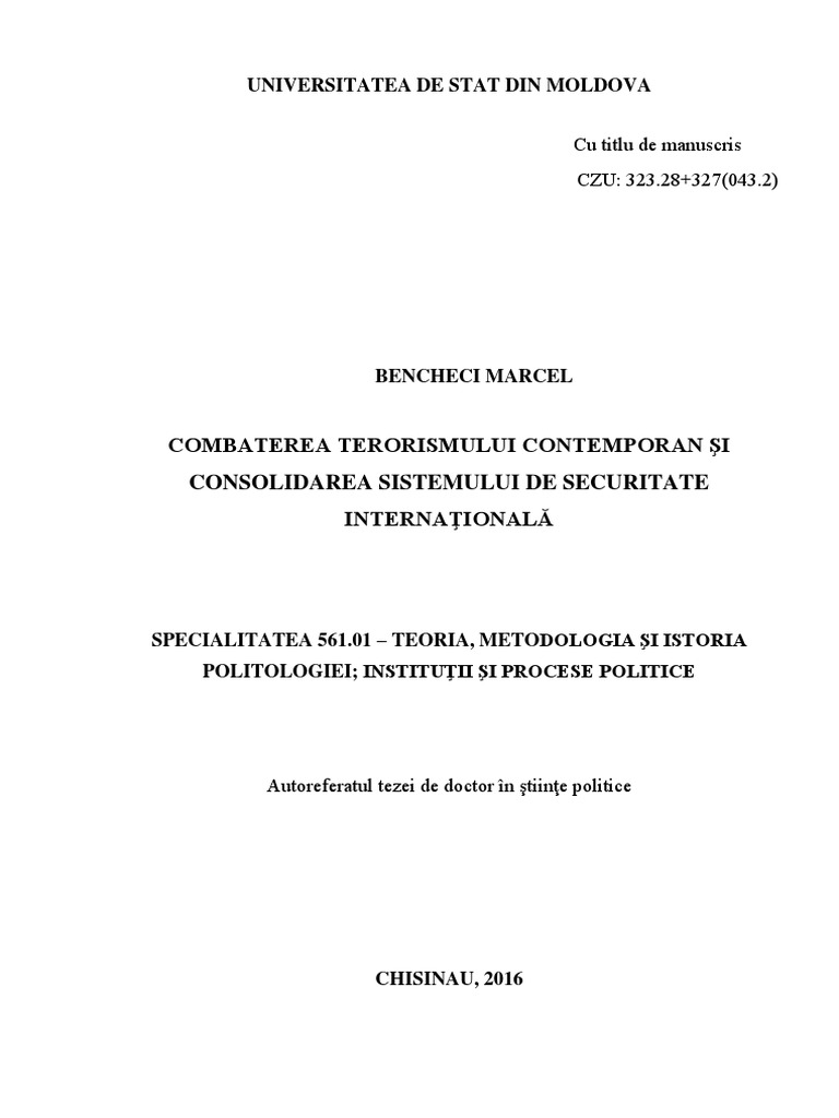 ntrire a securitii internaionale; cercetarea rolului Republicii Moldova n combaterea terorismului i