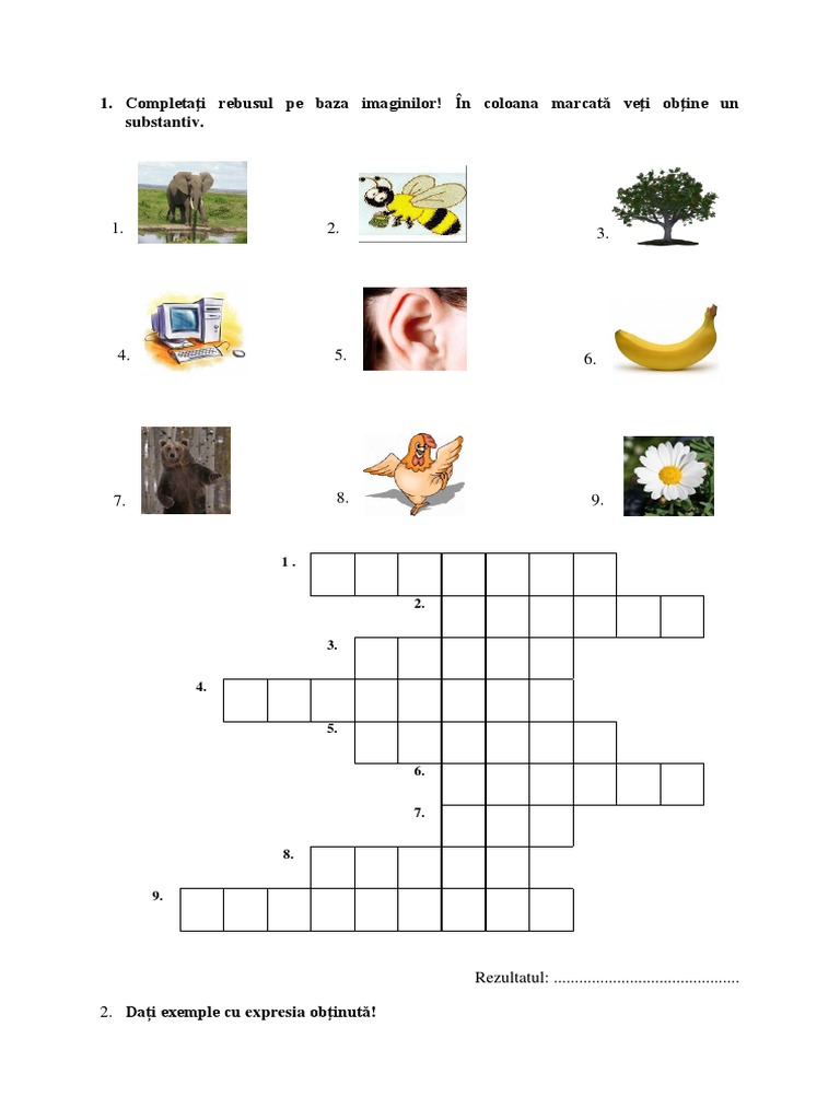 Documentul prezintă un rebus cu imagini în 9 căsuțe și cere completarea lui pentru a obține un substantiv rezultat. Se cere și exemplificarea expresiei rezultate.