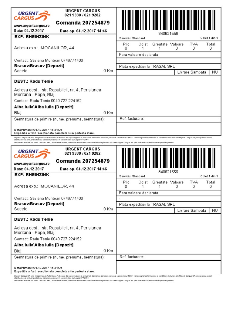 Semnatura de primire (nume, prenume, semnatura): Ref. facturare: