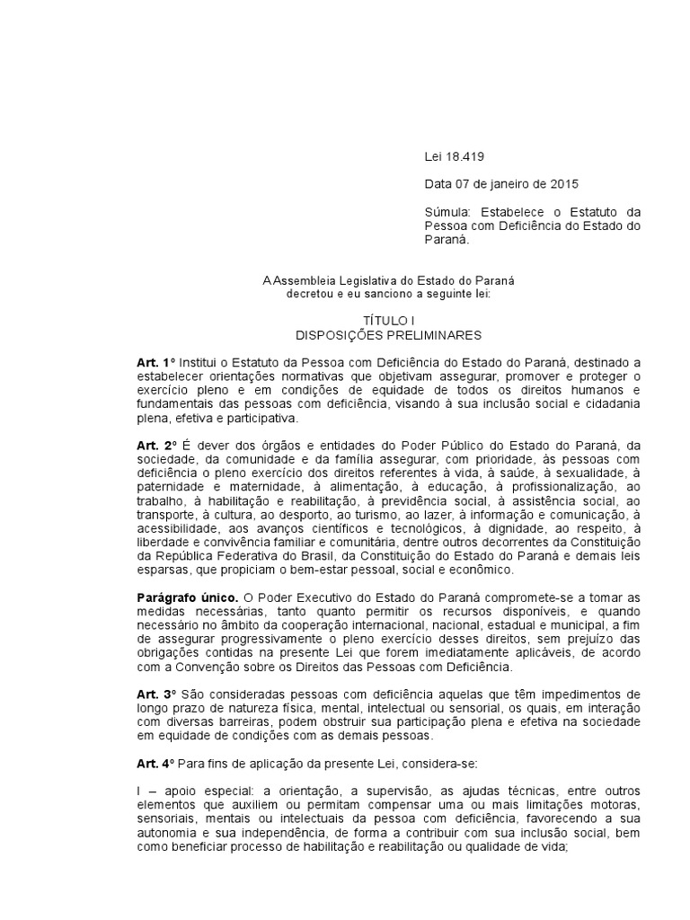 Súmula: Estabelece o Estatuto da Pessoa com Deficiência do Estado do Paraná.