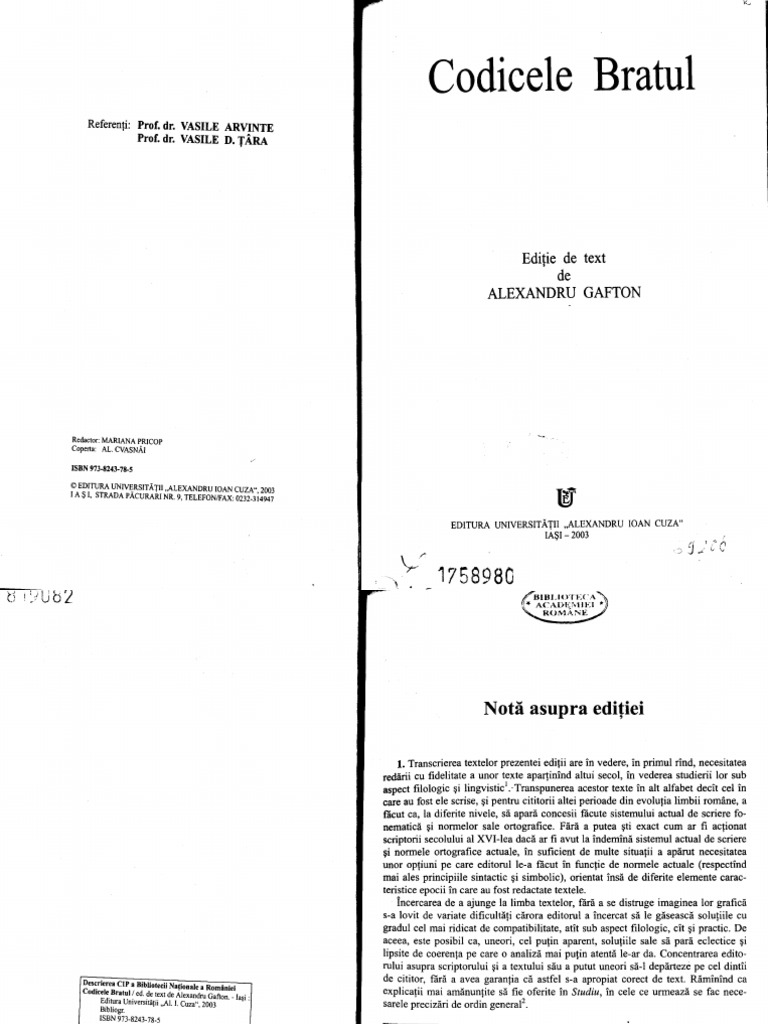 I. Gafton, Alexandru (ed.) 1 Principalul text transcris este Codicele Bratul (CB), text insotit de facsimil. Anexa cuprinde,